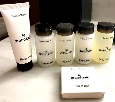 Thanks to my SPG Platinum status I received a Sheraton Club room. Like many bath amenities in SPG hotels in the US Le Grand Bain products are Canadian made. In the first picture 1bottle of the lotion and the shampoo appears to.